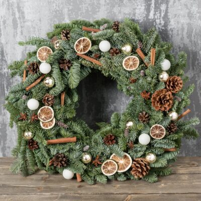 Natural and festive Christmas wreath crafted from pine branches, adorned with cinnamon sticks, pinecones, white and gold baubles, and dried lime slices. A charming blend of rustic elegance and seasonal warmth, perfect for holiday decorating.. INGRIDIENTS. Cinnamon, natural pinecones, mini pinceones, white baubles, lime slices