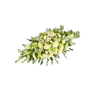 This funeral arrangement is made with roses and lilies for a beautiful and timeless look.